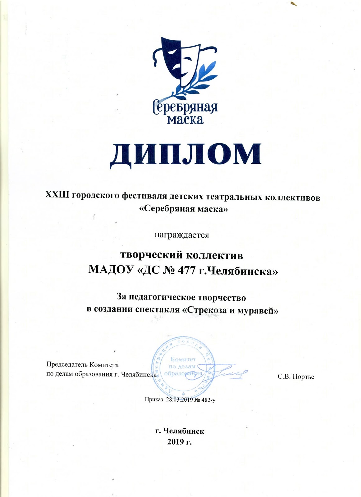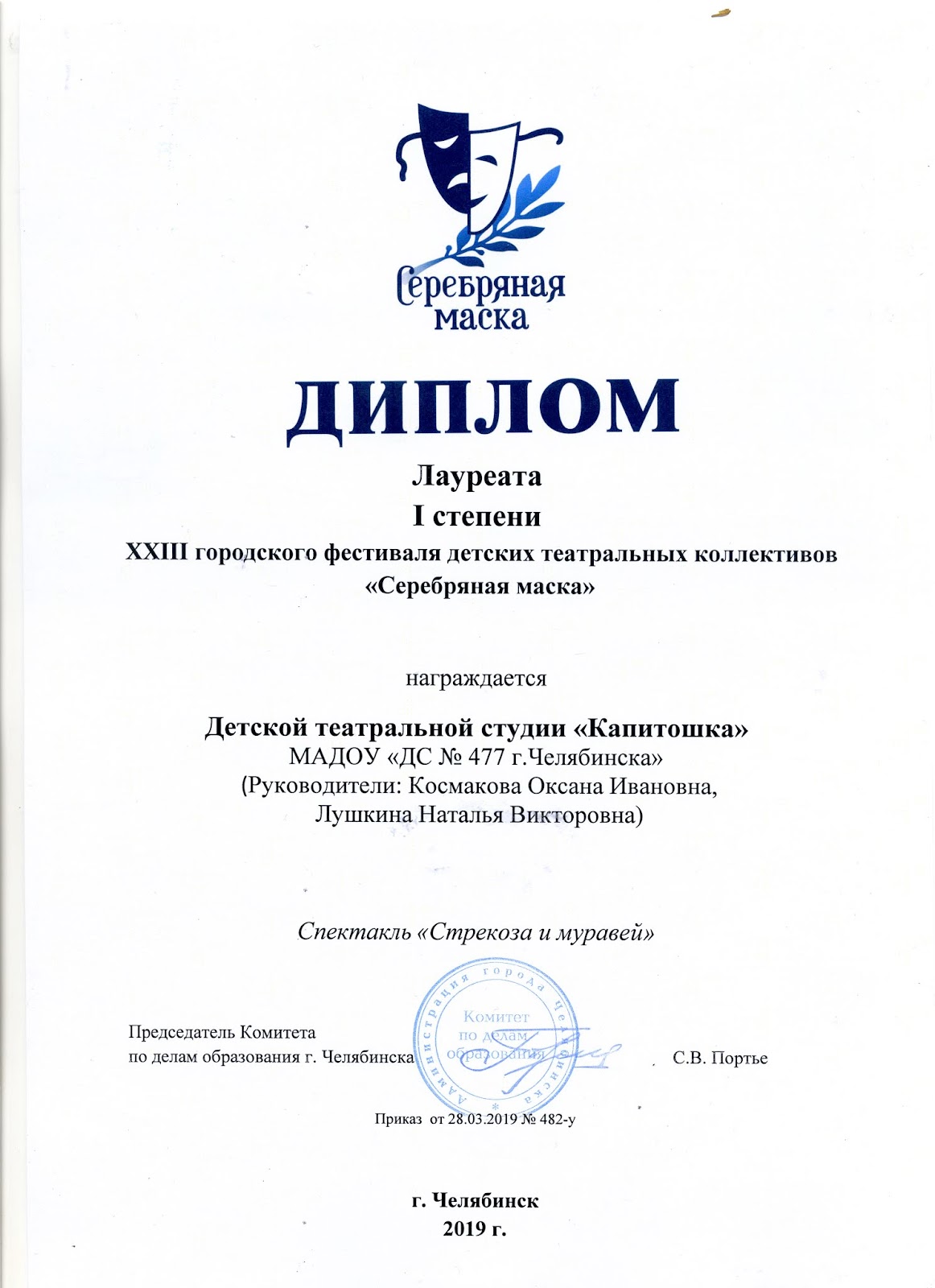 3 -Педагогический коллектив МАДОУ "ДС № 477 г.Челябинска" награжден за творчество в создании спектакля, а лично руководитель студии Лушкина Наталья Викторовна.